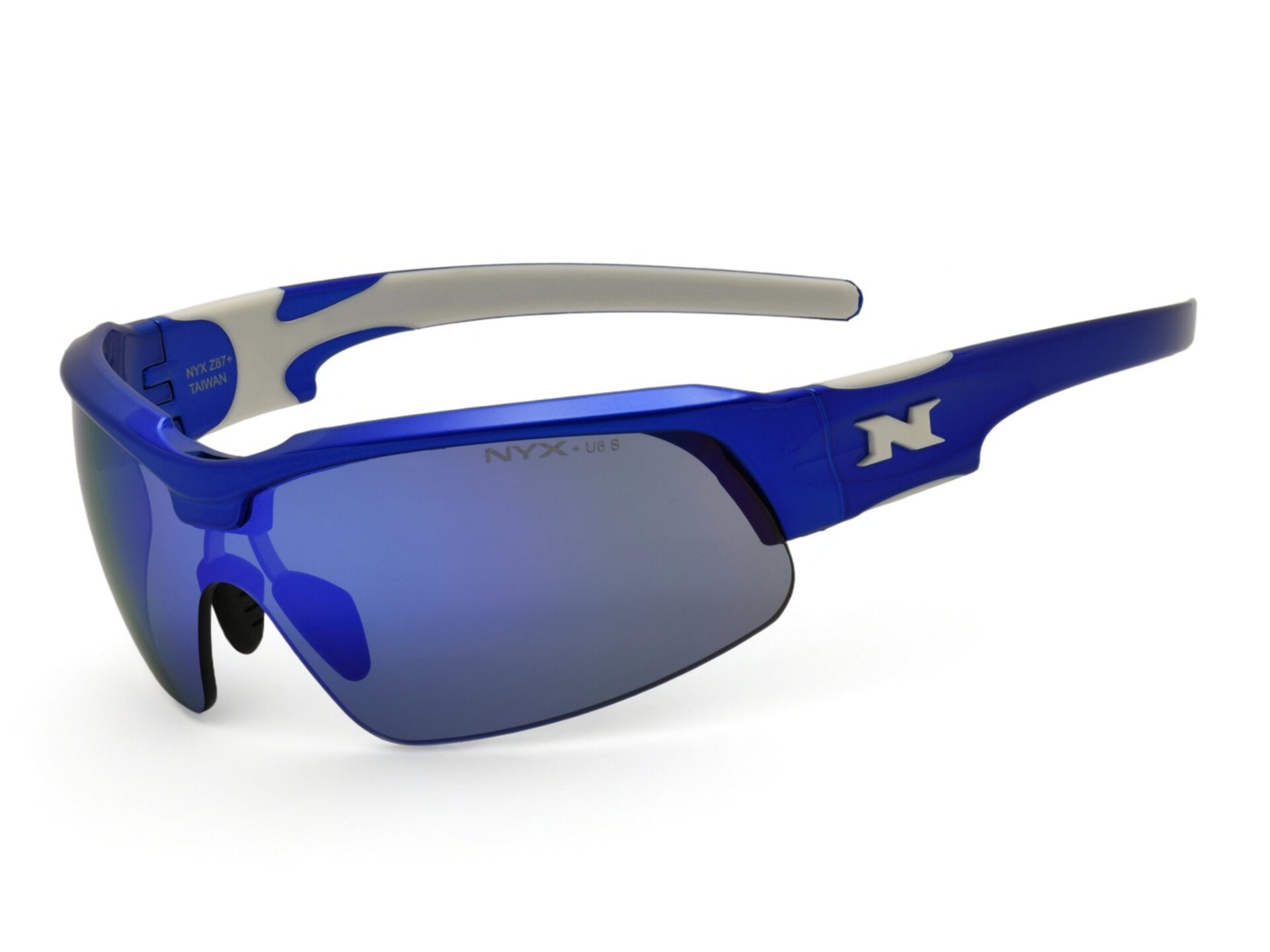 NYX Pro Z17 safety-rated eyewear for high-impact sports and industrial safety eyewear applications. Meets ANSI Z87.1+ ballistic eye protection standards. Wide and flat temples distribute pressure evenly with a secure fit. Adjustable nose pieces ensures comfortable universal fit. Bundle includes blue/white frame, gray safety shield lens with Arctic Blue mirror and Rx insert with your prescription.